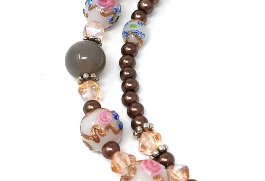 Collana girocollo con perle in vetro lavorate a mano. Focale ricamato in bead embroidery con cristalli e decorazione in resina dipinta a mano.