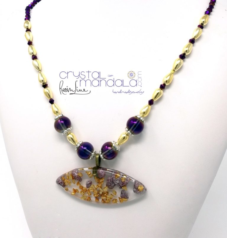 Collana in luminose perle di pasta vitrea e componenti color oro. Componente centrale realizzato a mano in Krystal1. Pezzo unico – Realizzato a mano. Made in Italy.
